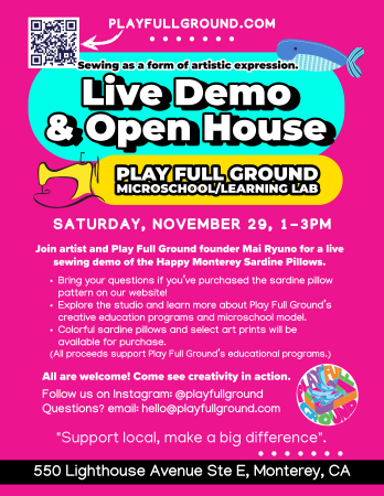Play Full Ground is selling Mai's colorful Happy Monterey Sardine Pillows, ONLY during the holiday season. Purchase one online and pick up at the studio in November or December by appointment. If you'd like to pick up your pillow on Nov. 29, please order by Nov. 24.