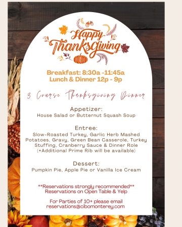On Thanksgiving Day, 12pm-9pm, Cibo Ristorante Italiano is offering a special 3-course Thanksgiving dinner. Join us for cozy vibes, seasonal dishes, and reasons to be thankful.