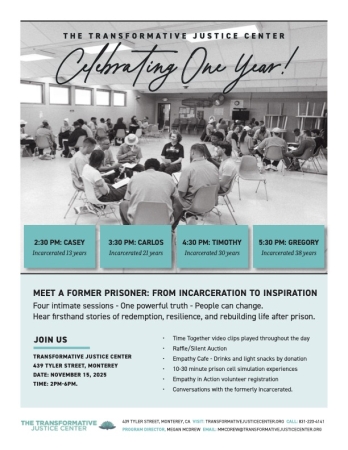 The Transformative Justice Center invites you to join us in celebrating our first anniversary on Saturday, November 15, 2pm-6pm.