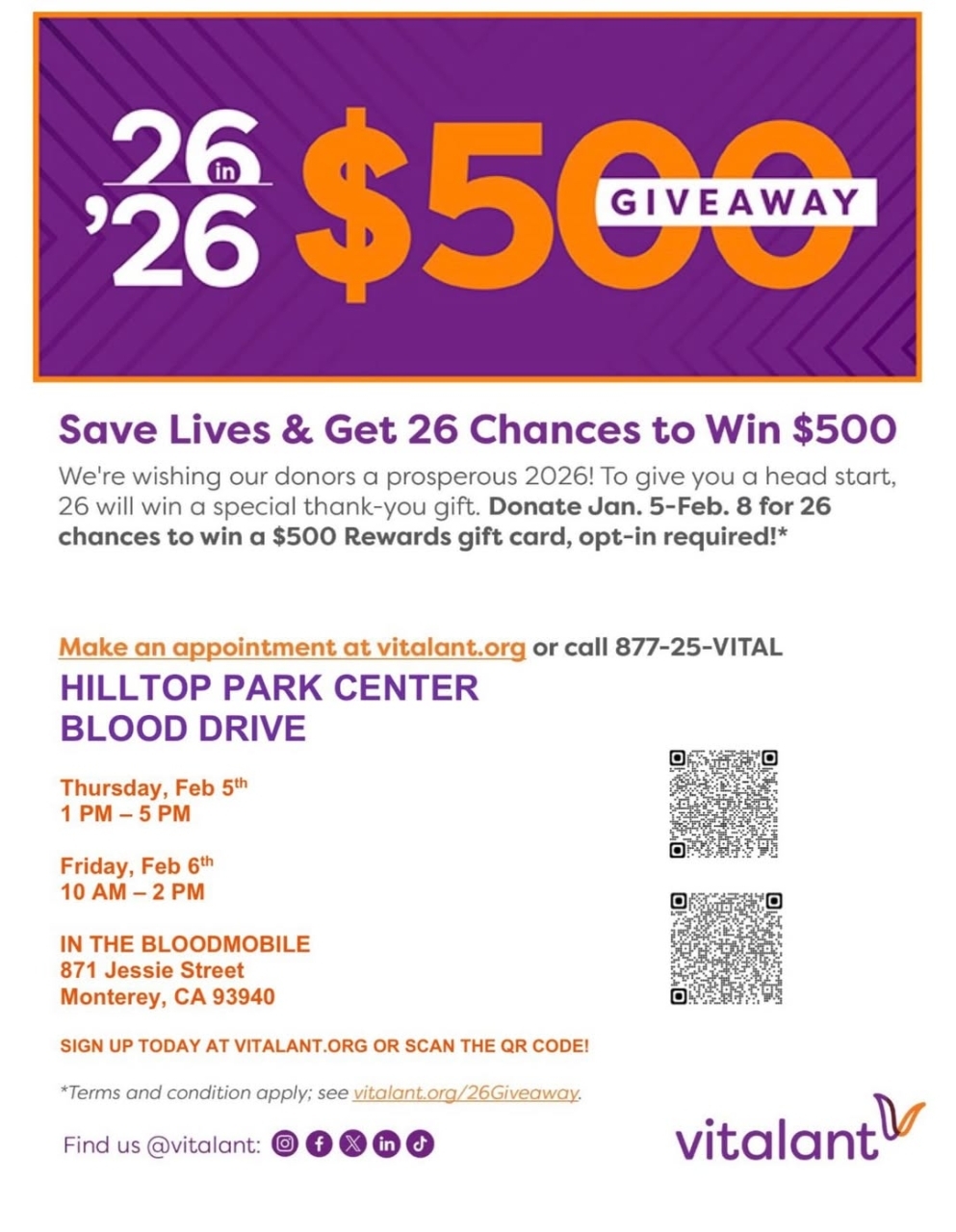 Hilltop Park Center is hosting two blood drives with Vitalant: Thursday, February 5, 1pm-5pm, and Friday, February 6, 10am-2pm. Register for Thursday ... or ... Register for Friday.