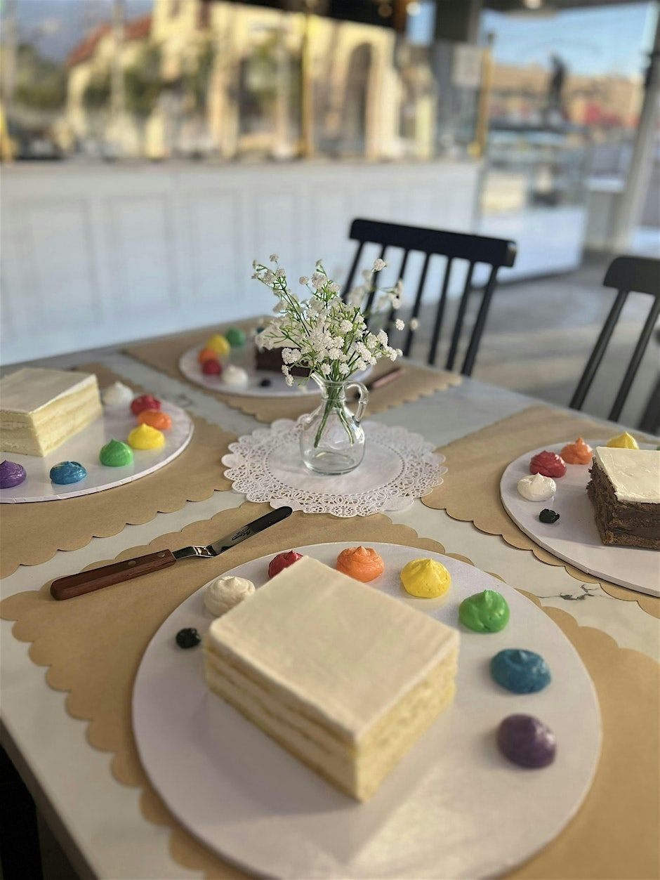 All guests will receive a blank frosted cake, a palette of colored buttercream, and two complimentary drinks of choice (coffee, tea, beer, or wine). You'll take home your edible masterpiece.