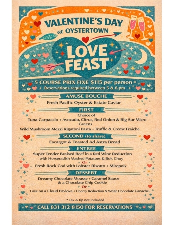 This Valentine’s Day, join Oystertown for our first annual Love Feast, a 5-course prix fixe dinner crafted with nothing but love. Seatings between 5pm & 8pm. Reservations required - call 831-312-8150 or email us.