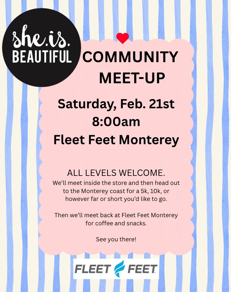 She.Is.Beautiful invites you to join us for a community meet-up at Fleet Feet Monterey on Saturday, February 21. We’ll meet in the store at 8am then head out to the coast and travel the Monterey Rec Trail.