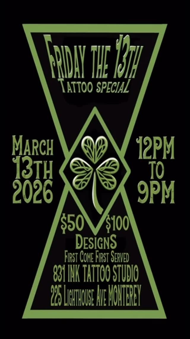 831 INK is having a tattoo special on Friday the 13th, 12pm-9pm! Tattoos are first come, first served (no trading sign ins). No cap on number of tattoos per person, available designs are $50 and $100 each. We'll have a lot of designs to choose from.