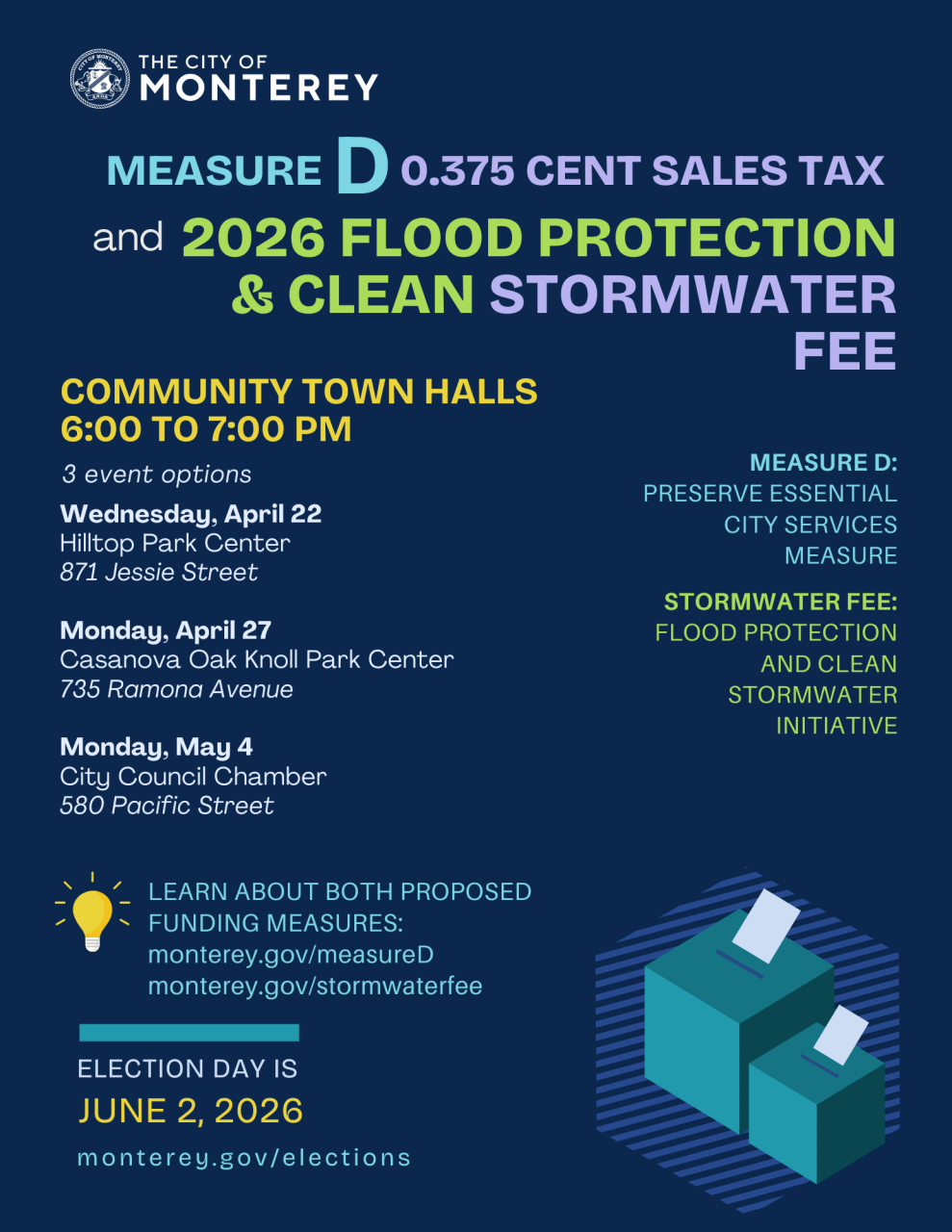 The City of Monterey is hosting a Community Town Hall on Wednesday, April 22, 6pm-7pm at Hilltop Park Center to discuss the 0.375 cent sales tax measure and the flood protection and clean stormwater initiative that will be voted on at a special election on June 2, 2026.