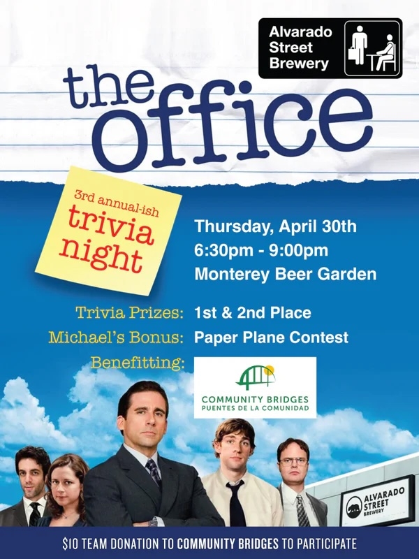 Alvarado Street Brewery is holding The Office Trivia Night in the beer garden on Thursday, April 30, 6:30pm-9pm!