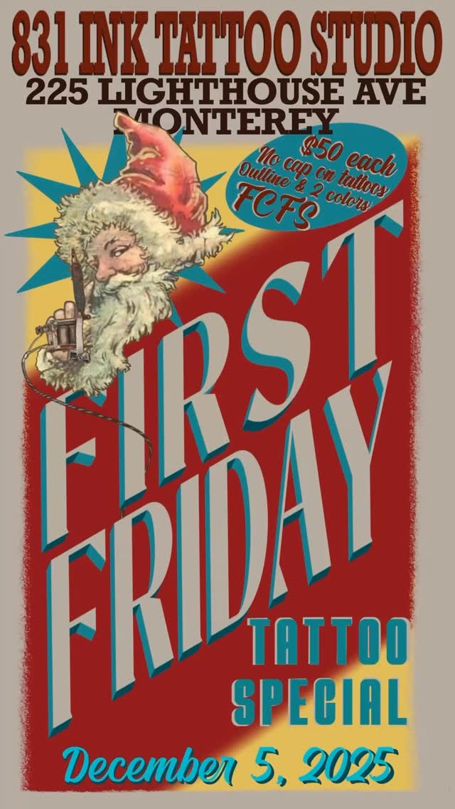 831 INK offers a tattoo special on the first Friday of every month, 2pm-8pm. Tattoos are first come, first served (no trading sign ins). No cap on tattoos per person, $50 each. We'll have a lot of designs to choose from.