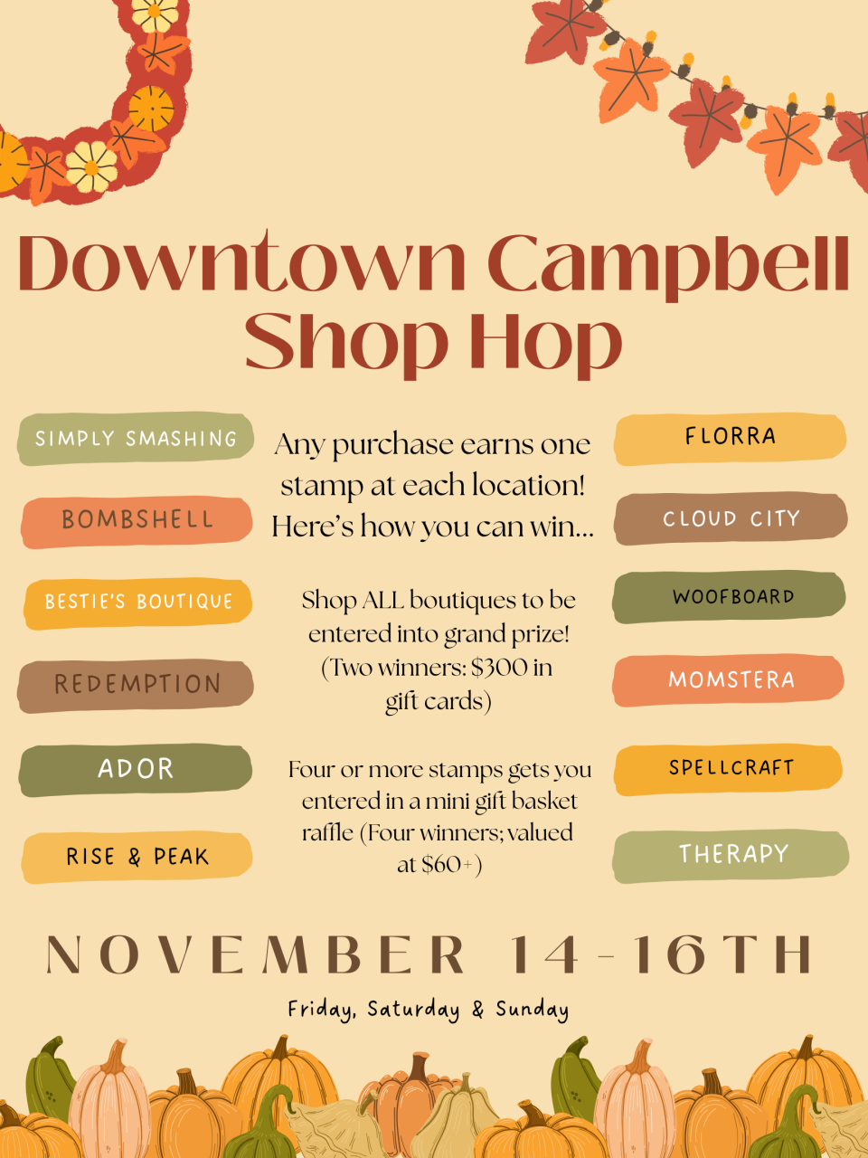 We're excited to gather 12 Downtown Campbell shops together for a weekend of retail therapy! Grab a punch card and collect stamps at any of the following participating locations for a chance to win prizes!