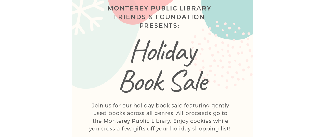Monterey Public Library Friends and Foundation is hosting their Holiday Book Sale December 8 & 9, 10am-4pm, in the Community Room of the Library. You'll find gently used books across all genres. Enjoy cookies while you cross a few gifts off your holiday shopping list! Proceeds will benefit Monterey Public Library.