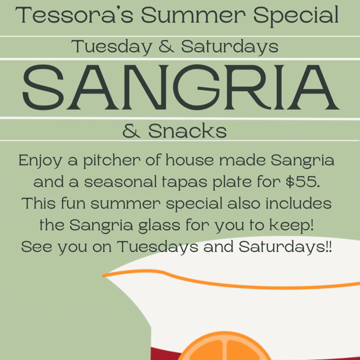 Every Tuesday and Saturdays at Tessora's this summer is Sangria & Snacks from 4 to 8pm! You'll get to enjoy a pitcher of their special house made Sangria and a seasonal Tapas plate for $55. This fun summer special also includes the Sangria glass for you to keep and take home.