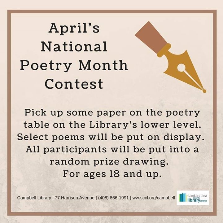 Adults are invited to participate in a poetry contest at the Campbell Library all through the month of April as a way of celebrating National Poetry Month. Just pick up some paper on the poetry table on the Library's lower level. Select poems will be put on display. All participants will be put into a random prize drawing. For ages 18 and up.