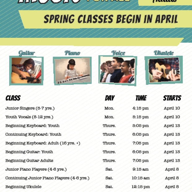 Don't miss your opportunity to sign up for classes in guitar, voice, piano and ukulele.