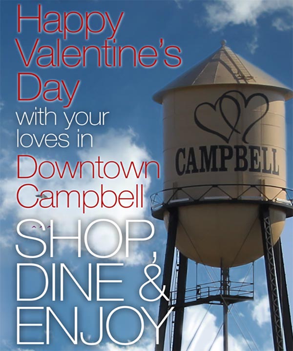 Downtown Campbell is for Valentines! Our merchants want to show you the love with some special February deals and events themed for the occasion. Bring your sweetheart, a friend, or just yourself and enjoy yourself in Downtown Campbell this Valentine's Day.