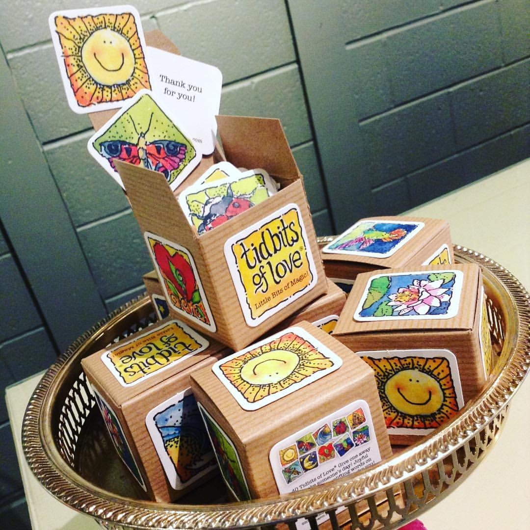 Affect someone's day in a positive way! Tidbits of love: messages of gratitude & inspiration on whimsically designed little cards - 40 Tidbits per box. Slip one into a pocket, on a pillow or a keyboard...leave one on a tip tray with your tip...or as a surprise on a park bench... Endless possibilities! . . .