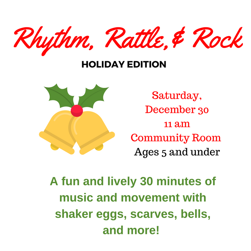 Come with your toddler for a fun and lively 30 minutes of music an movement with shaker eggs, scarves, bells, and more! Ages 5 and under.