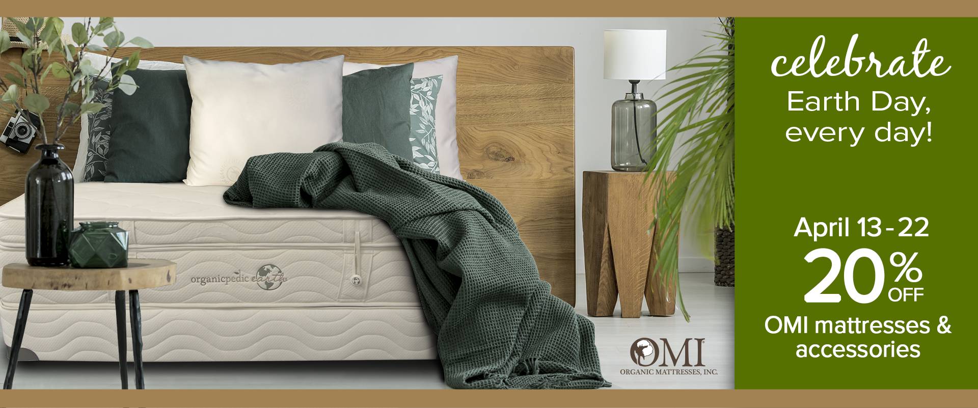 OMI's Earth Day Sale is happening now at Mattress Nation. April 13-22, 2018, save 20% on OMI organic mattresses and accessories. Visit us in Monterey at 296 Lighthouse Avenue.
