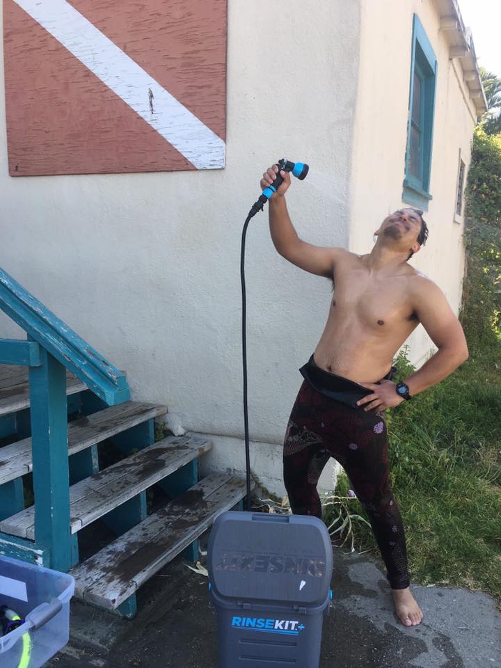 The job of a dive professional is a busy one. Jose needed a shower on the fly so he used one of Bamboo Reef's new RinseKits. They're great for giving yourself and your gear a quick post-dive rinse. Grab your own Rinsekit before we run out - we're located at 614 Lighthouse Avenue in Monterey.