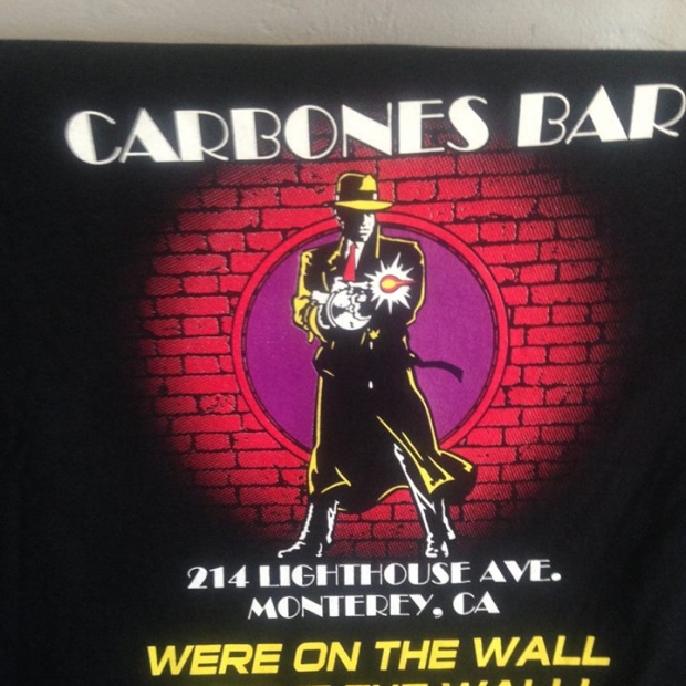 The new Carbone's Bar t-shirts are in, and they're a must have! The front of the shirt shows a gangster and our name, the back shows the gangster in front of the wall, and they're $25 each. And yes, you can read it any way you want... Stop by Carbone's at 214 Lighthouse Avenue in Monterey and buy one.