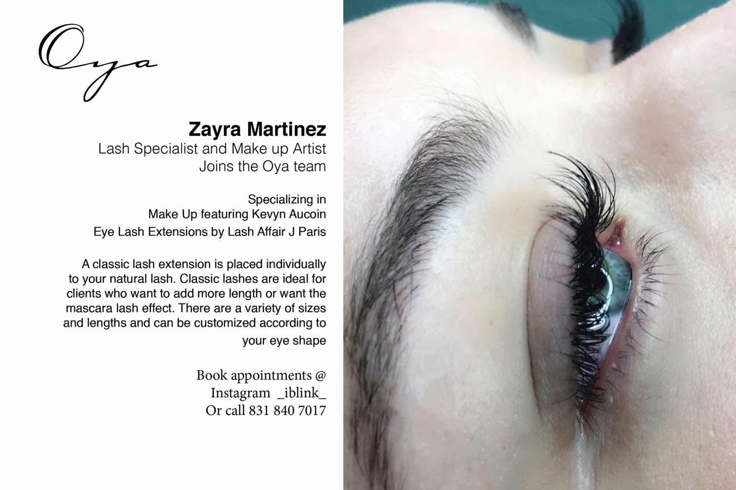 Oya Salon welcomes Zayra Martinez, a lash specialist and make up artist, to our team! Zayra specializes in make up featuring Kevyn Aucoin and eye lash extensions from Lash Affair J Paris. Please phone 831-840-7017 for appointments.
