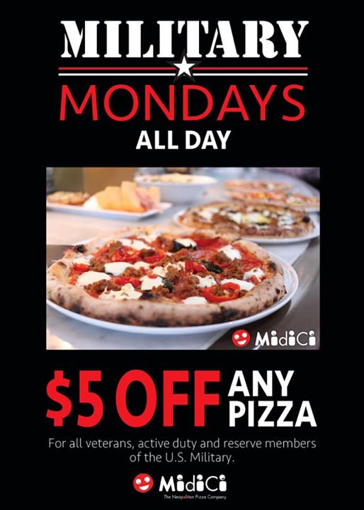 MidiCi Neapolitan Pizza invites you to join us for Military Mondays. All day, every Monday, we offer $5 off any pizza to veteran, reserve, and active members of the U.S. Military. We're located at 467 Alvarado Street in Old Monterey.