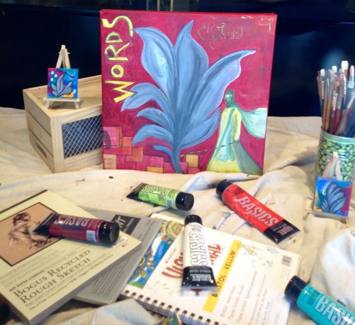 "Words Matter" - 16"x16" - multi-media painting by local artiste, Amy Steinberg. Find it among more of Amy's equally wonderful artwork in our front window.