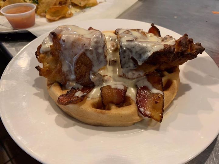 Sunday Brunch at il Sogno features a $10 menu all day long and THIS. It's the Flavor Flav & Waffle. It's a corn meal breaded fried chicken breast served atop a fresh house-made waffle with bacon and gravy.