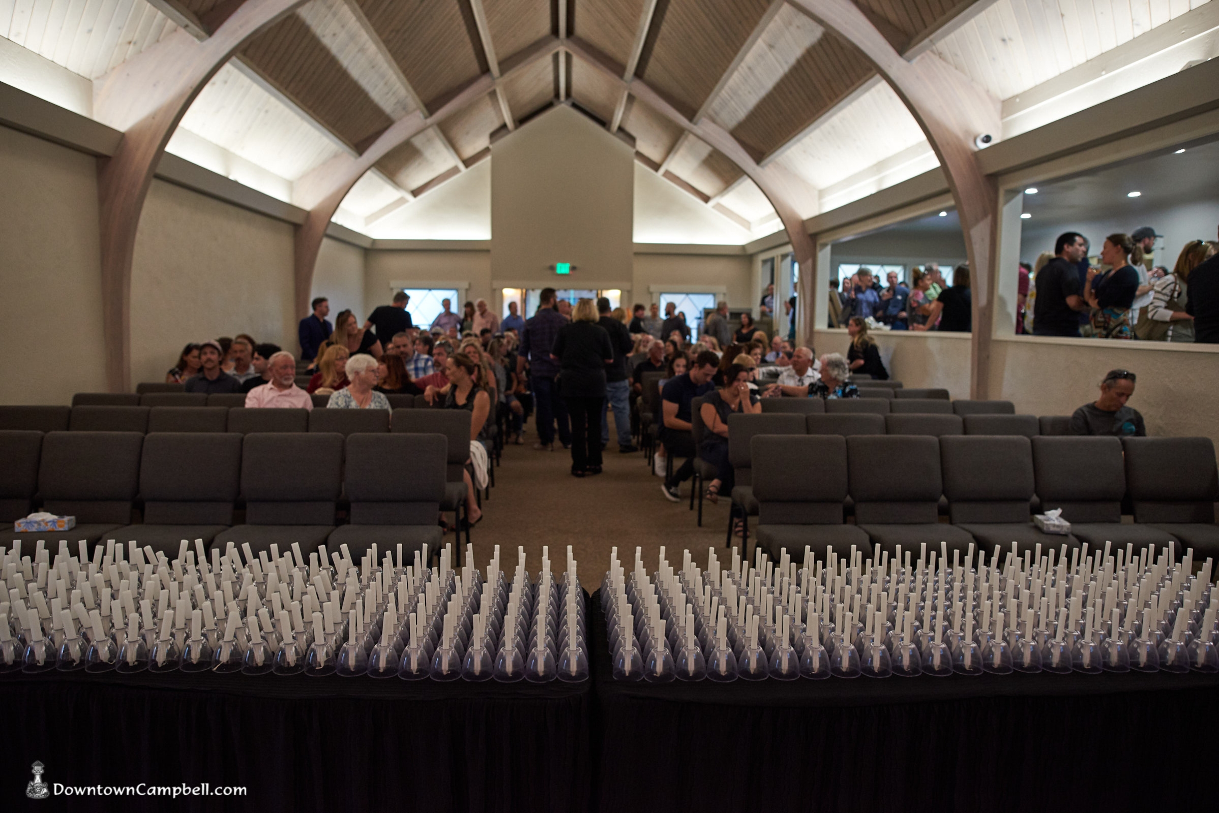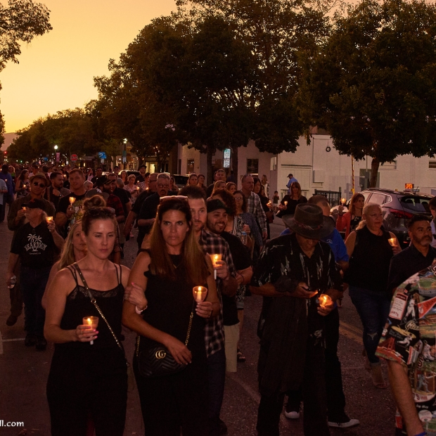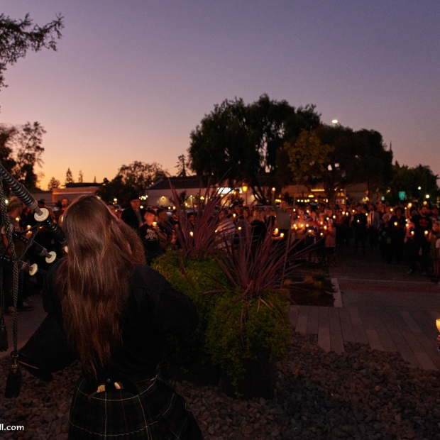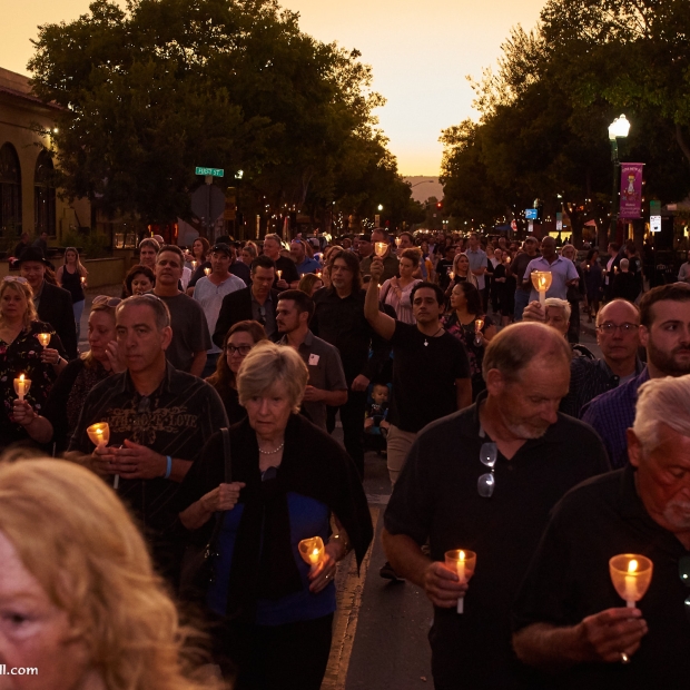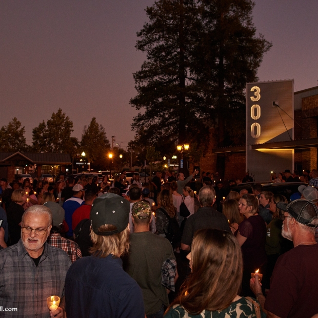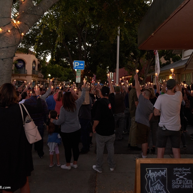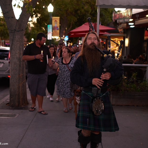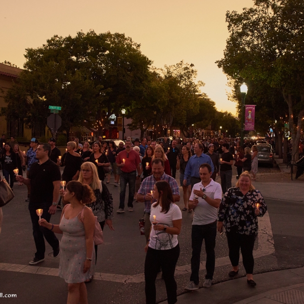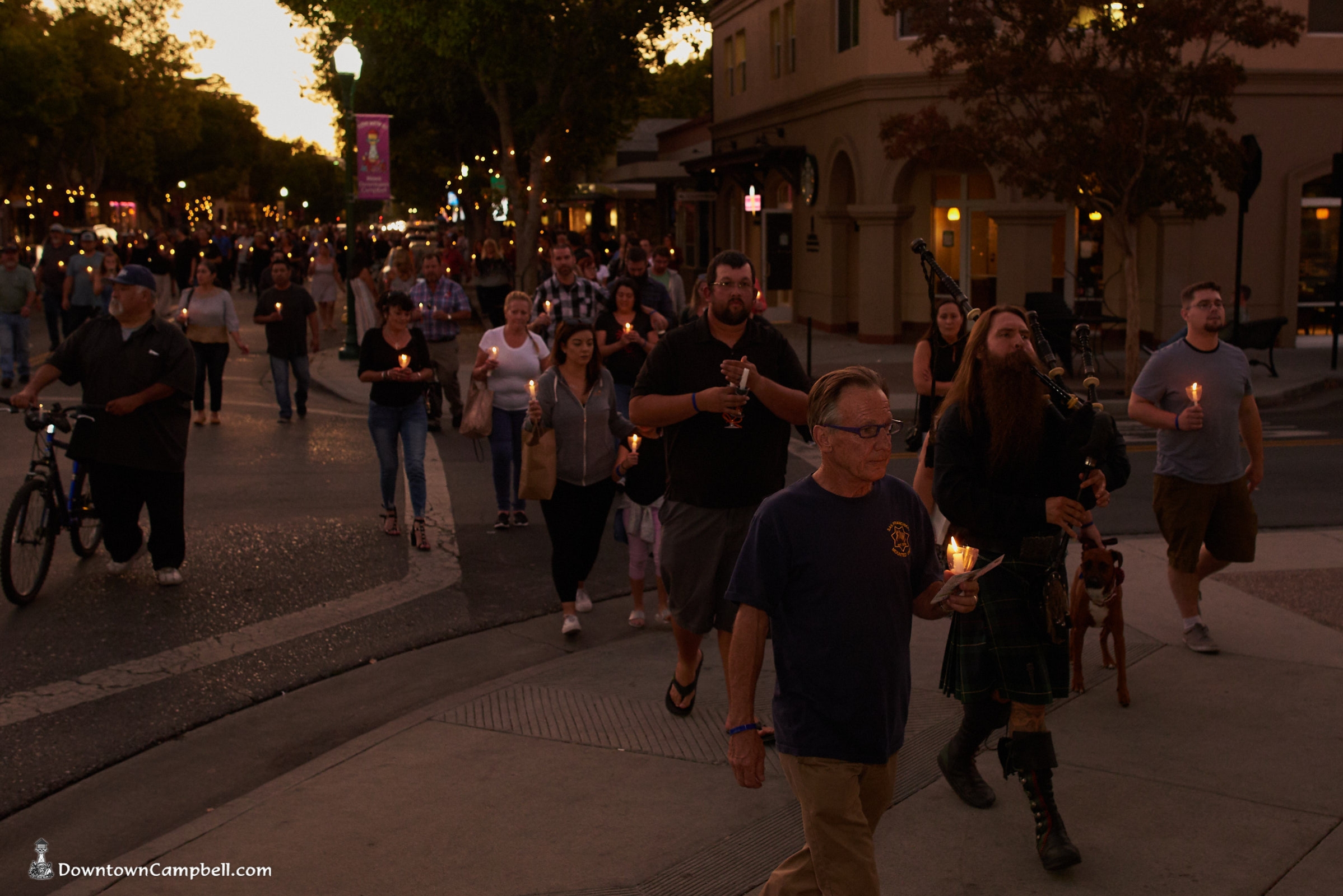 It was an unusual sight in Downtown Campbell this Monday night. Traffic was heavy and parking spaces were hard to come by even though many of the stores were closed early. Our apologies for the inconvenience, but we were honoring a friend. We didn't plan to close the street on you, but when a river of flickering candles spills into the street and drifts silently down the road, it's a road closure by any other name. We're also sorry that some who came to the event didn't get a candle. There were 500 prepared and a few more than expected showed up.