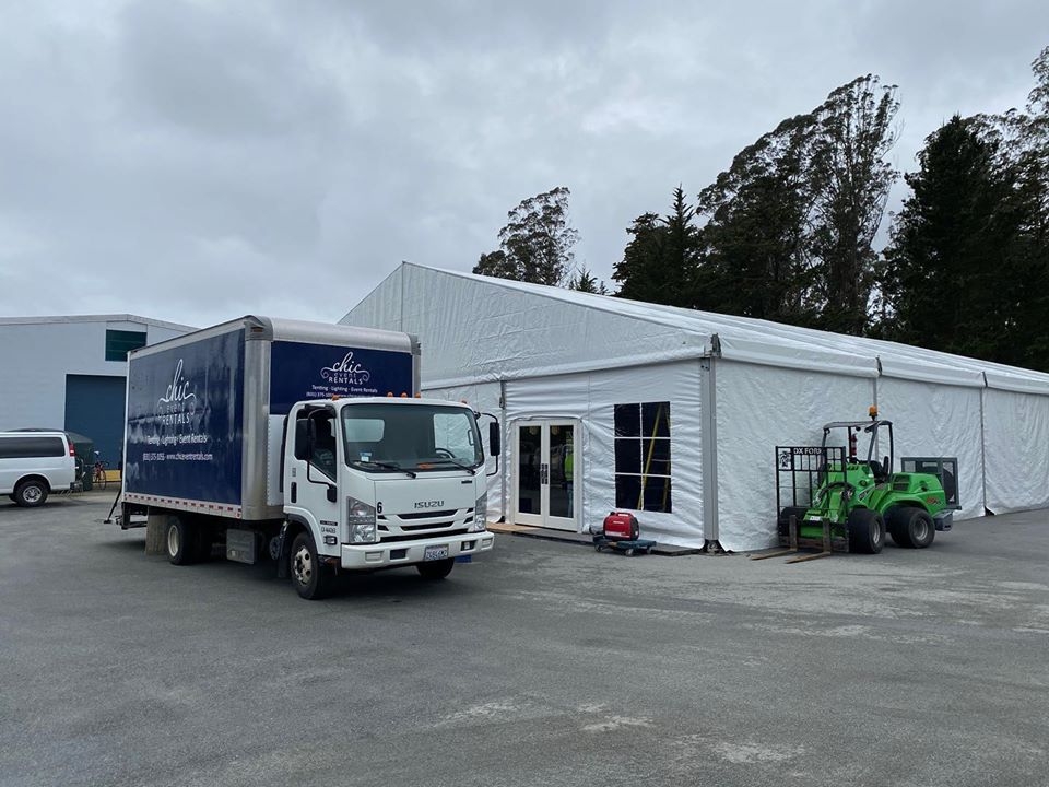 Who has the equipment and expertise to set up large tents in an emergency? Event rental companies! And the Lighthouse District's own Chic Event Rental is ready to answer the call. The Chic truck is pictured here with a 5000 square foot Emergency Response Housing Tent their team just set up.