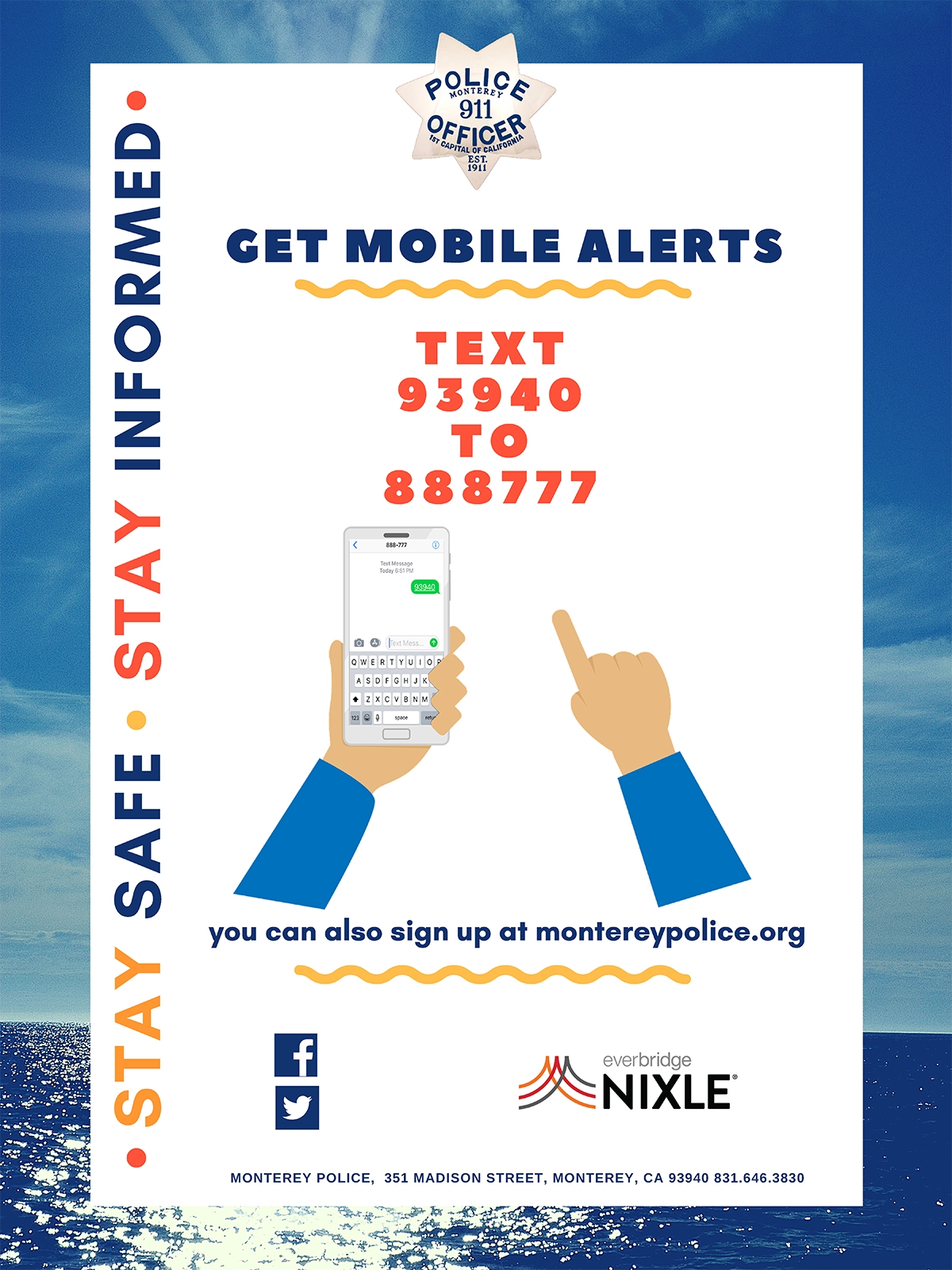 If you live in one city, work in another, or have family in yet another location, you can sign up for alerts from all the areas you want! To receive text alerts that are specifically for the City of Monterey, take one more step and text 93940 to 888777.
