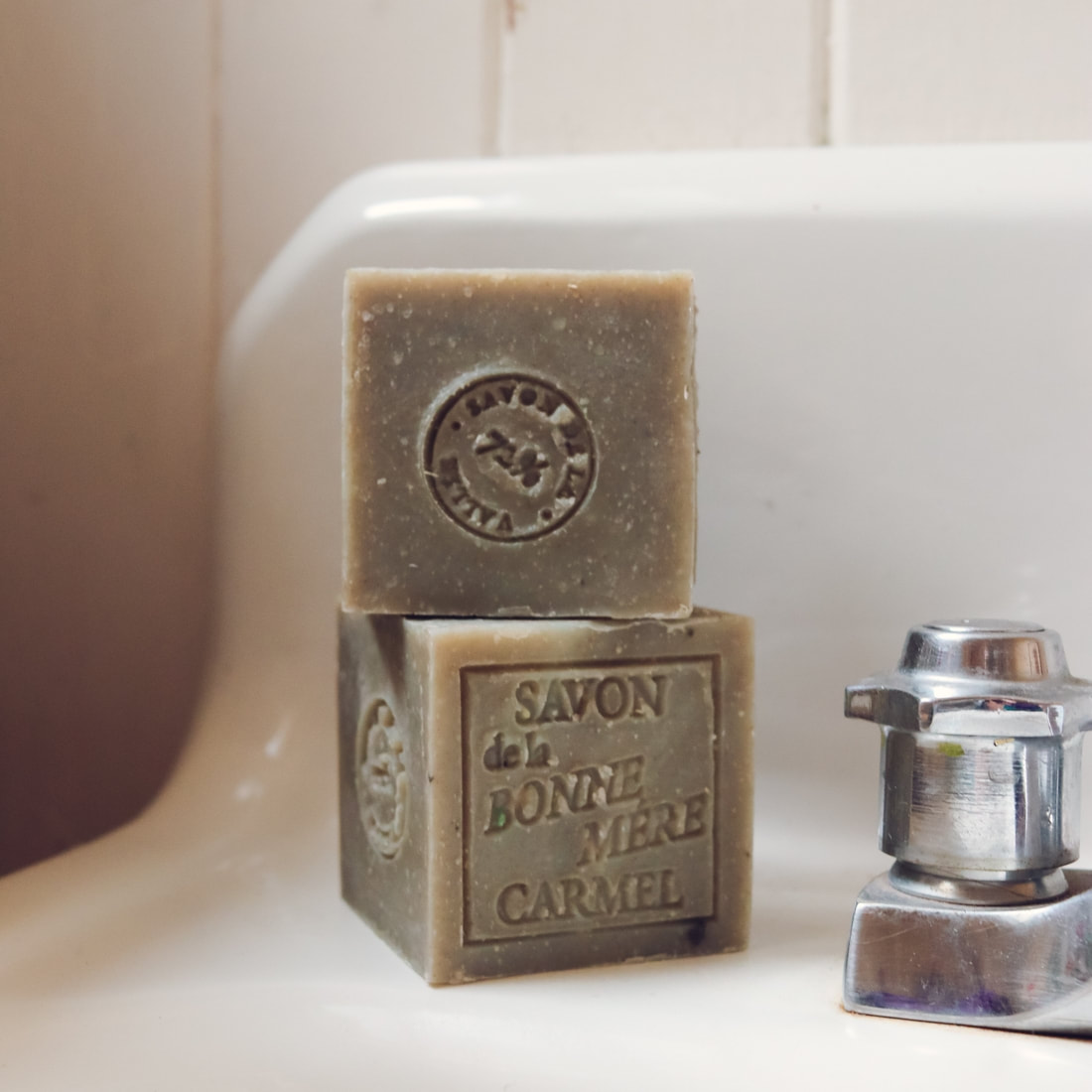 Savon de Carmel's soap contains no palm oil or parabens and is vegan, all natural, and organic. It is available in bars (small) or cubes (large) both in the store and online for curbside pickup or shipping.