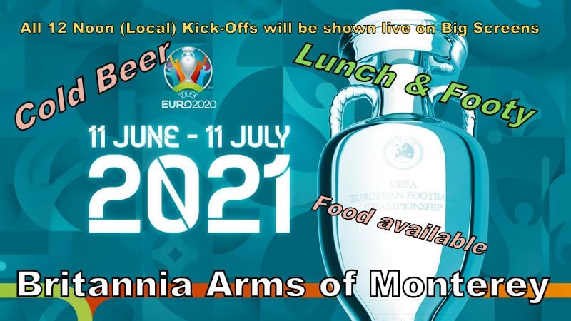 Beginning June 15, Britannia Arms of Monterey will be showing all the 12pm (local time) matches of the 2021 European Championship on our big screens. The Britannia Arms, located at 444 Alvarado Street in Downtown Old Monterey, is the headquarters for soccer on the Monterey Peninsula! Enjoy lunch, a cold beer, and some football with us.