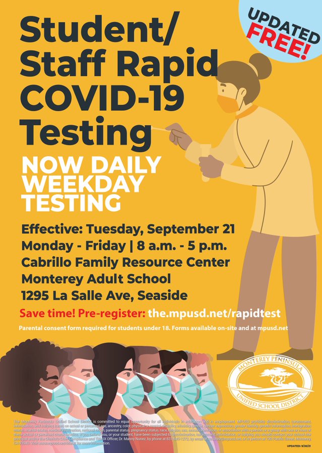 Monterey Peninsula Unified School District is now offering free rapid Covid-19 testing for MPUSD staff and students Monday - Friday, 8am-5pm, at Cabrillo Family Resource Center, 1295 La Salle Avenue in Seaside. Walk-ins are welcome, or you can make an appointment online here.