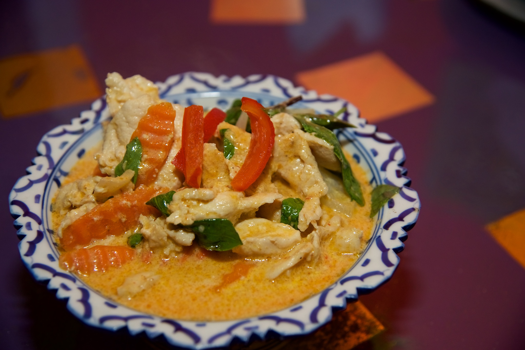 Siamese Bay Restaurant invites you to stop by and try our Panang Curry. This light, sweet, and spicy Thai dish is very popular in Bangkok and is perfect for a cool, early autumn night. Our chef learned the recipe from her mother in Thailand. Pictured here is Panang Curry with chicken, but each dish is made to order with your choice of meat, seafood, or vegetarian options.