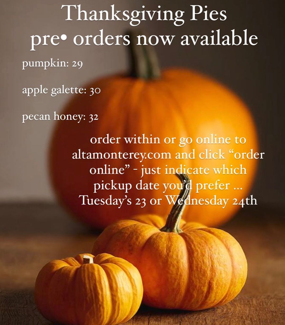 It's pie time! Come to Alta Bakery and Cafe and preorder pies for your Thanksgiving festivities. We have 3 delicious options: classic pumpkin pie ($29), pecan-honey pie ($32), and apple galette ($30). Visit us at 502 Munras Avenue in Downtown Old Monterey and fill out a form to order yours, or place your order online. Pickups available on Tuesday, November 23, and Wednesday, November 24.