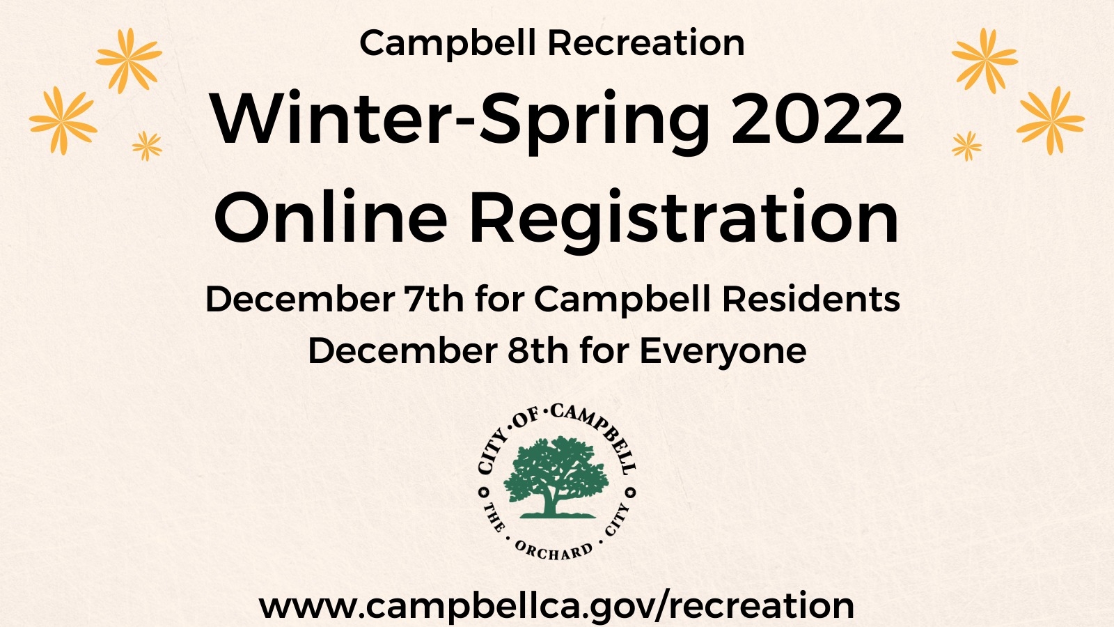 Campbell Recreation Winter-Spring 2022 Registration Begins next week! Winter is approaching fast! Registration for the Winter-Spring 2022 classes begins on December 7th at 9 AM for Campbell Residents and December 8th at 9 AM for everyone else. Check out the classes we are offering and register before they are full! https://secure.rec1.com/CA/campbell-ca/catalog