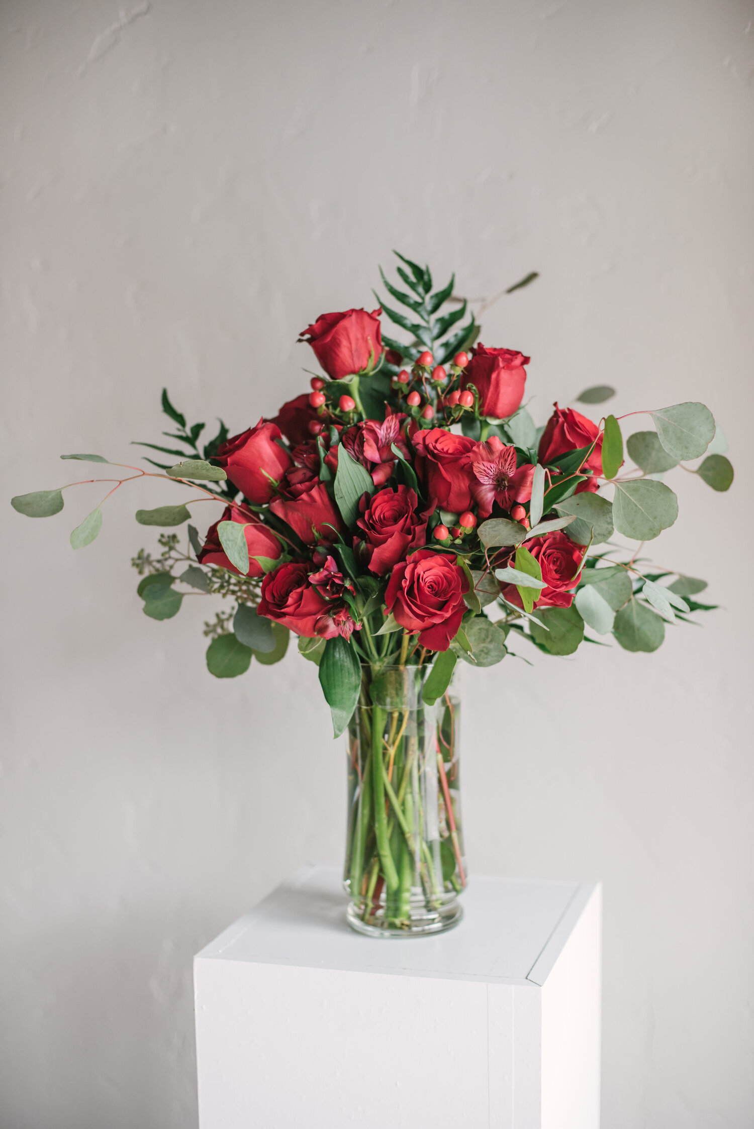 Watch out! Cupid has his eyes set on you. Declare your affections with One dozen ruby red roses wrapped with a variety of greenery and berries for $65. You have a choice of a hand wrapped bouquet or a vase arrangement.