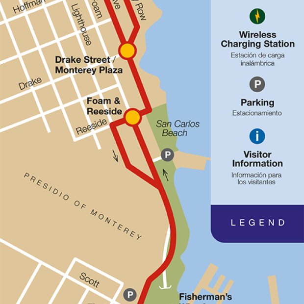 The Monterey trolley returns! This free service will operate July 3 - September 6, 10am-6pm daily. Park in the Downtown Monterey Garage (340 Tyler Street), Cannery Row Garage (601 Foam Street) or at the Waterfront Lot (between 245 Washington Street and the Wharf) and get a free ride to all of your favorite attractions including the Monterey Bay Aquarium, Cannery Row, the Lighthouse District, Downtown Old Monterey, and Old Fisherman's Wharf.