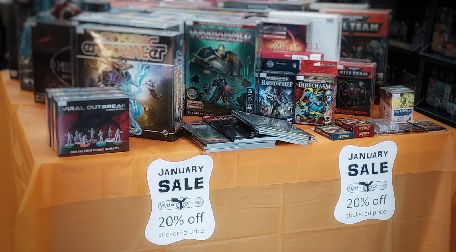 In January 2023 there's a special table at Mythic Games Monterey filled with sweet items offered at 20% off the sticker price. You'll find some great board games, miniature games, and card games from big names such as Games Workshop, Wizkids, Gale Force Nine, and more.
