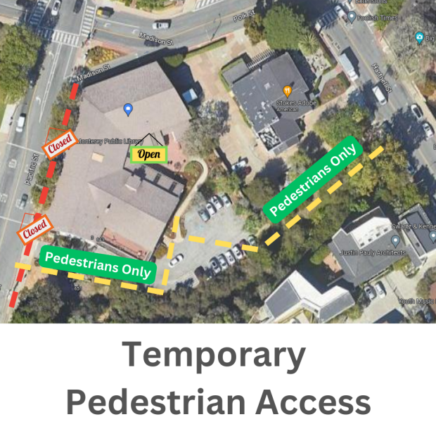 During that time, the library will only be accessible through the back entrance. the Library's back parking lot will be closed to vehicles, and the book return on Pacific Street will be temporarily moved to the driveway.