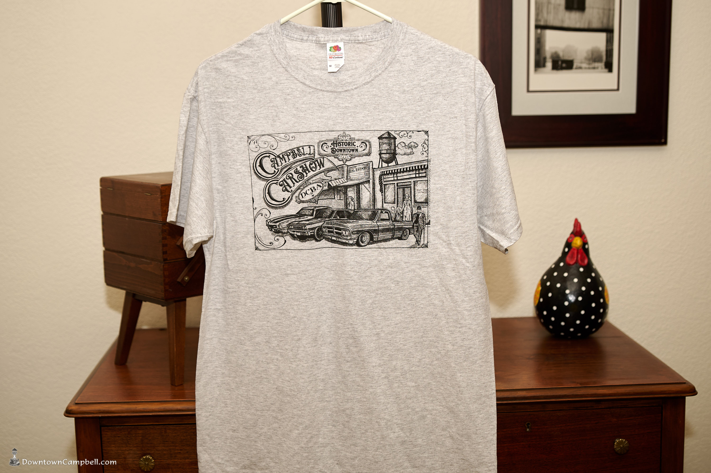 The t-shirt is 96% cotton in a throwback heather gray color featuring the Historic Downtown Campbell Car show artwork in black print on the front. On the back are the local businesses that sponsored the show.