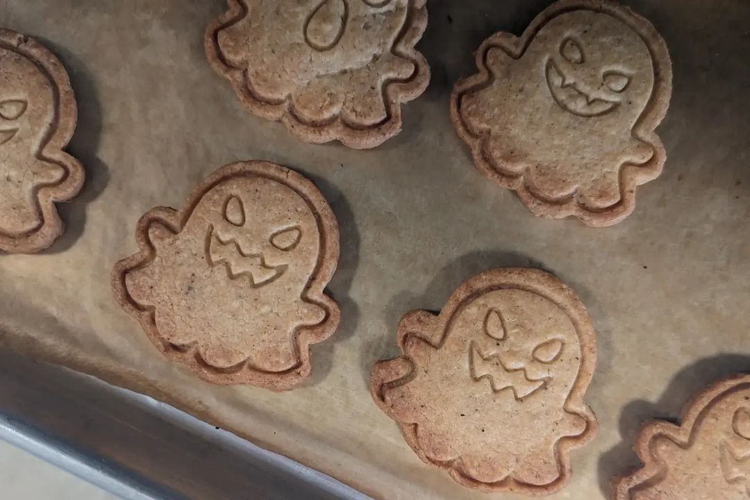 Ad Astra Bread Co. has been selling some festive Halloween-themed treats in the shop at 479 Alvarado Street in Downtown Old Monterey. Items include Schezhuan pepper ghost cookies, a pistachio cream puff shaped like a goofy monster, pan de muerto, munecas, and our R.I.P. cake (a two-layer black velvet cake with salty black cocoa pudding buttercream that serves six). So much fun!