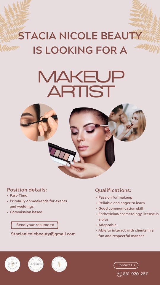 Stacia Nicole Beauty seeks a part-time makeup artist available primarily on weekends for events and weddings. Payment is commission-based. Candidates must have a passion for makeup, be reliable and eager to learn, have good communication skills, be adaptable, and able to interact with clients in a fun and respectful manner. An esthetician / cosmetology license is a plus. Please email your resume to Stacia Nicole Beauty.