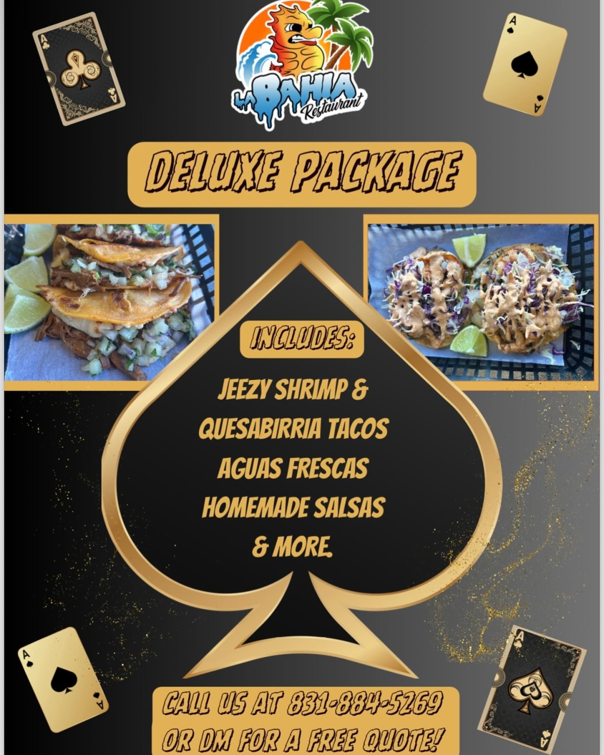 Did you know that La Bahia Mexican American Restaurant offers catering? Ask us about our Deluxe Package, which includes Jeezy Shrimp and Quesabirria Tacos, aquas frescas, homemade salsas, and more. And there are plenty of options available! Call us at 831-884-5269 for a free quote. We're located at 675 Lighthouse Avenue in Monterey.