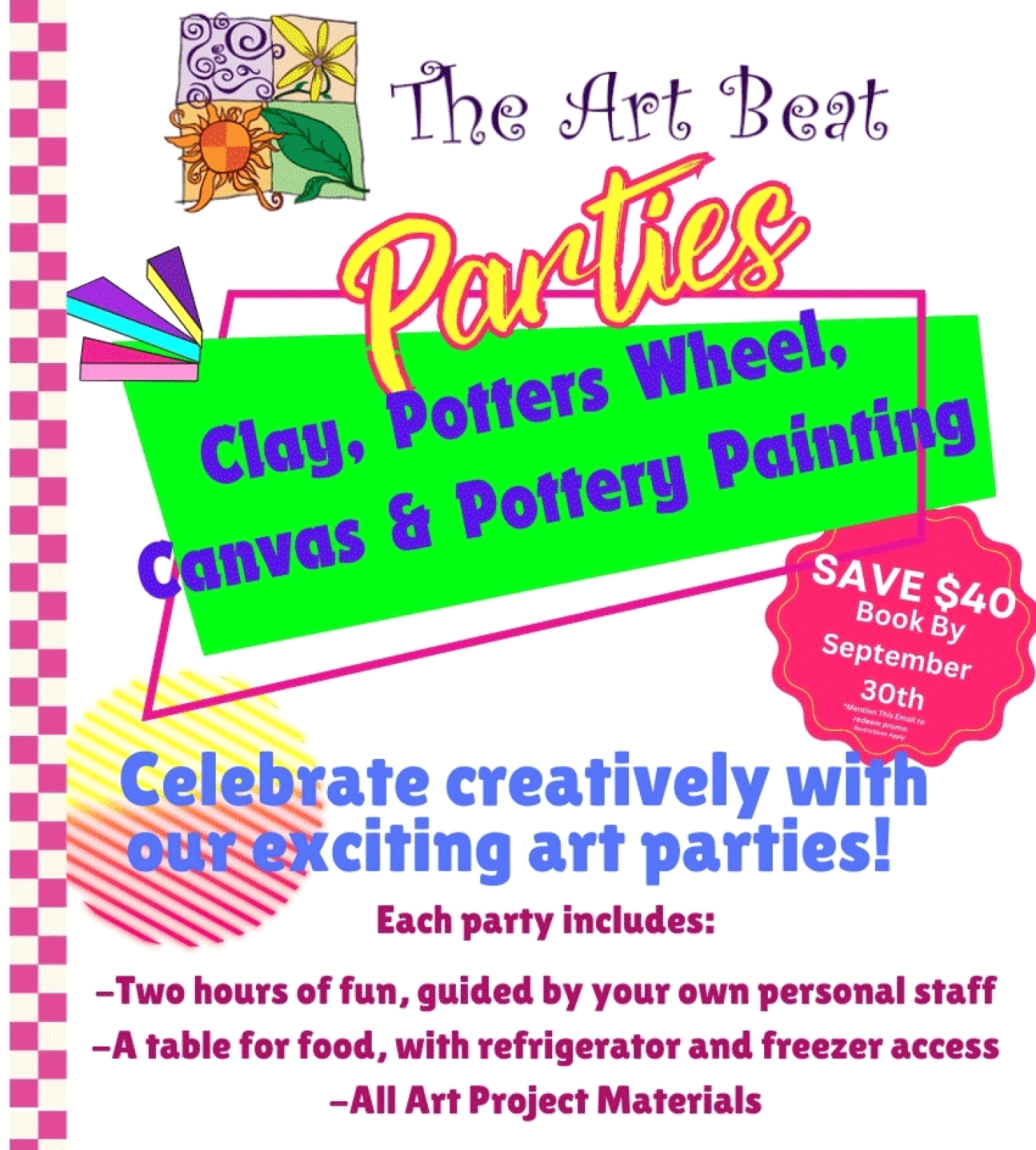 - Two hours of fun, guided by Art Beat instructors