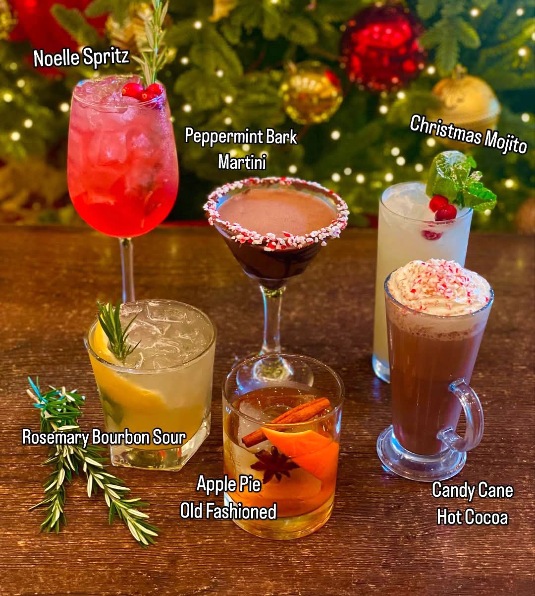 Sip on cozy seasonal favorites and discover exciting new signature cocktails perfect for celebrating with friends and family. Enjoy a Noelle Spritz, Peppermint Bark Martini, Christmas Mojito, Rosemary Bourbon Sour, Apple Pie Old Fashioned, and Candy Cane Hot Cocoa. There's something for everyone to enjoy.