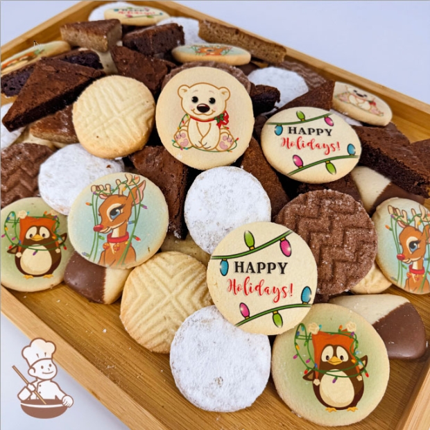 Preparing holiday cookie and brownie trays, dessert boards, yule log cakes, custom printed shortbread cookies, and an assortment of pies and decorated cakes. Order on our website for pick up at our Monterey boutique, Fri-Sun, 10am-1pm, or at our Watsonville bakery daily. We'll be closed Dec. 25-Jan. 1.