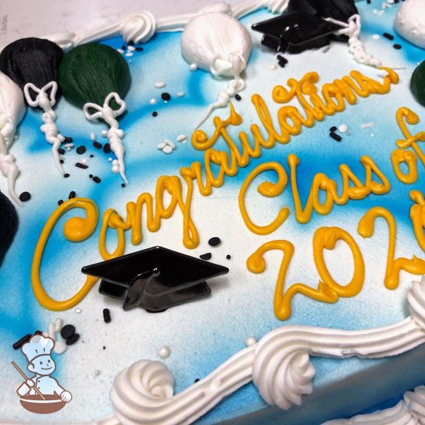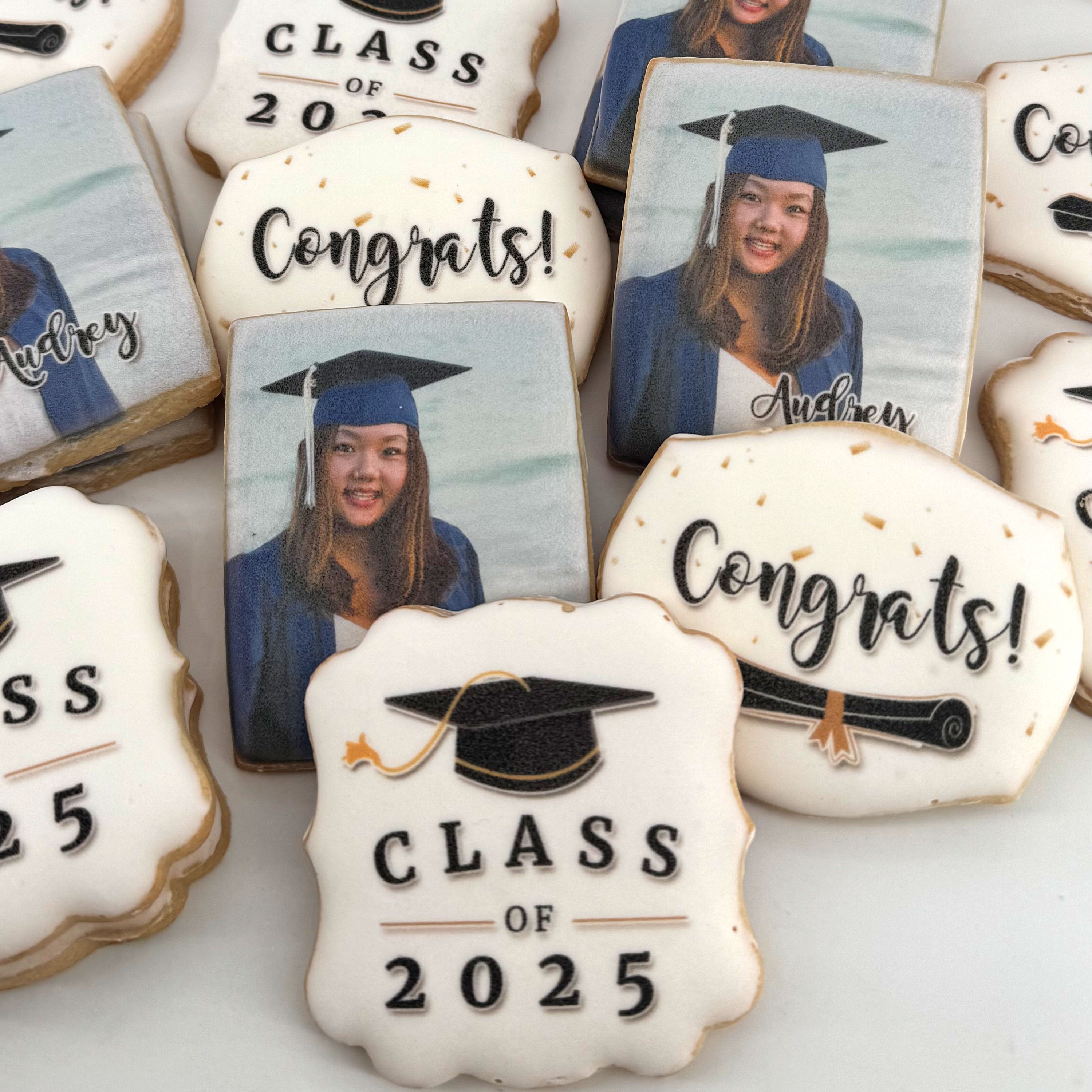 Order cookies with a personal message of congratulations, your grad's cap and gown photo, or an image of the school mascot. Learn more about our cookies here.