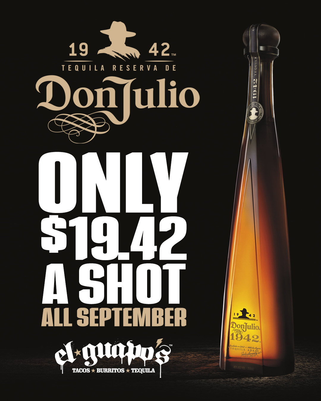 All September long, El Guapo's in Downtown Campbell is featuring a special on the Luxury Premium Tequilas of Don Julio for $19.42 a shot.