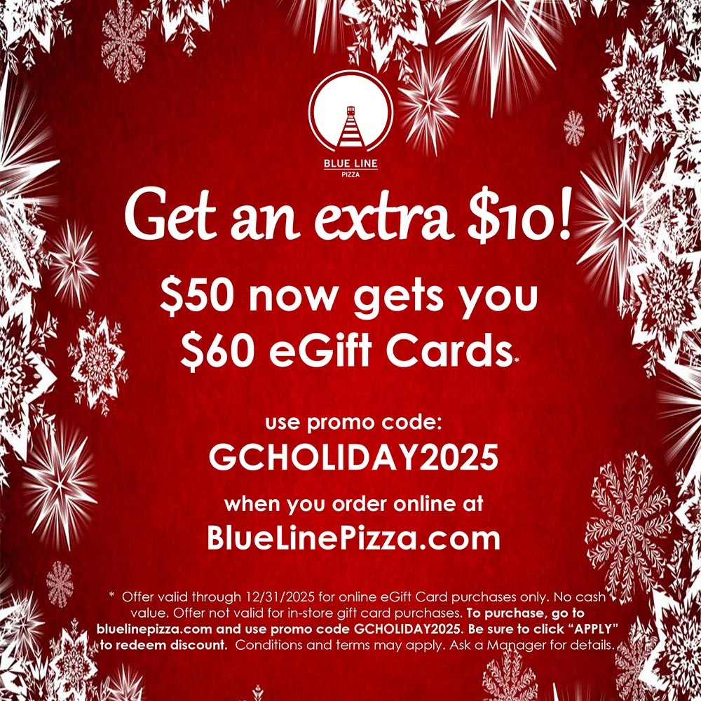 From now until the last day of 2025, you can get a $60 gift cards at Blue Line Pizza for only $50! That's a 20% bonus! Just use the offer code GCHOLIDAY2025 to claim your discount when you order your gift cards from Blue LIne Pizza.