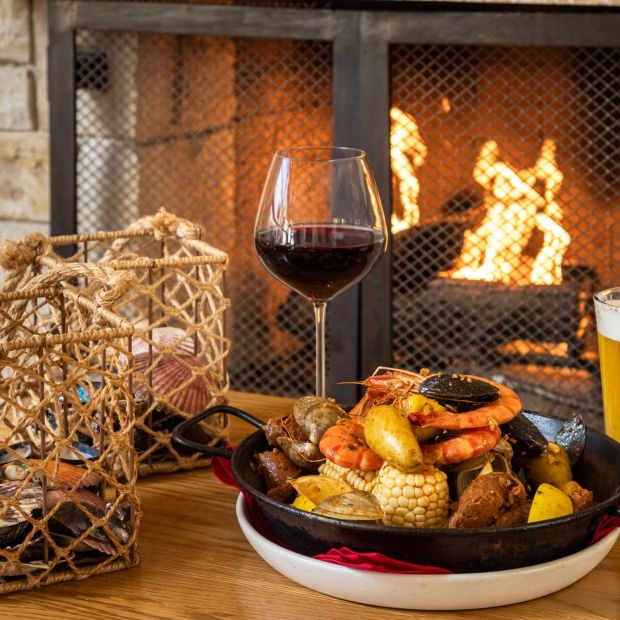 Served tableside in paella pans, the West Coast Shellfish Boil includes peel-and-eat prawns, clams, mussels, corn cob pieces, Spanish chorizo sausage, fingerling potatoes, and Chef Steven’s secret Cajun spice.